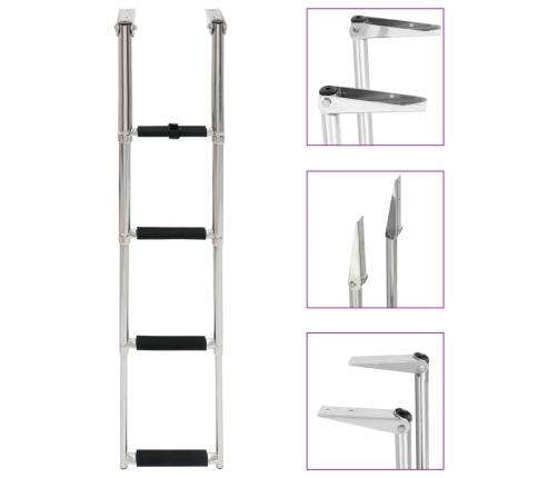 Kāpnēm ir unikāls, teleskopisks dizains, kas ļauj tās ātri un viegli salocīt, kā arī nodrošina drošu kāpšanu. Katram pakāpienam ir neslīdoša uzmava, kas garantē maksimālu drošību. Laivu kāpnes ir izgatavotas no ļoti stipra nerūsējošā tērauda, tādēļ tās ir īpaši izturīgas un var izturēt lielu svaru – līdz 250 kg. Kad kāpnes netiek izmantotas, pakāpienus var salikt kopā ar stiprinājumu siksnu. Sūtījumā ir iekļauti montāžas piederumi.