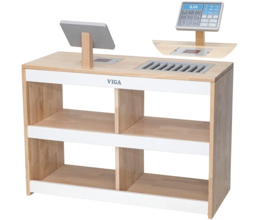 Drewniana Kasa Sklepowa od marki VIGA to idealne wyposażenie dla małych sprzedawców, które wzbogaci zabawę w sklep i odgrywanie ról. Wykonana z wysokiej jakości drewna, pomalowana nietoksycznymi farbami. Wyposażona w realistyczne elementy, takie jak atrapa kasy sklepowej z ekranem dotykowym, czytnik kodów kreskowych oraz rolki imitujące taśmę sklepową.