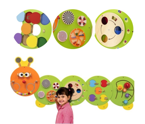 Wielofunkcyjna tablica ścienna z uroczym wizerunkiem gąsienicy. Zestaw składa się z 5 tablic z różnymi funkcjami. Tablice są bardzo łatwe w montażu i demontażu, jak również w transporcie. Tablica z wizerunkiem gąsienicy jest zabawką, na której jednocześnie może się bawić kilkoro dzieci. Mogą nie tylko bawić się dla przyjemności, ale także wiele się nauczyć. Pomaga w nauce kolorów, dźwięku, grafiki. Rozwija również koordynację ręka-oko oraz umiejętności społeczne. Genialna kombinacja zabawek dla szkół, przedszkoli, centrów nauki oraz miejsc publicznych. Produkt przeznaczony dla dzieci powyżej 18 miesiąca życia.
