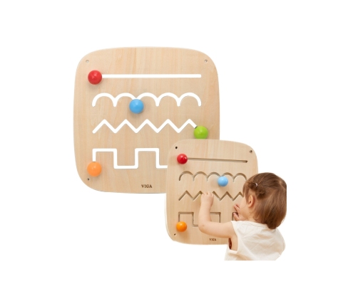 Ta drewniana tablica manipulacyjna to idealne narzędzie do nauki poprzez zabawę, stworzone z myślą o małych dzieciach od 12 miesiąca życia. Produkt pomaga w rozwoju koordynacji ręka-oko i motoryki małej, wprowadzając maluchy w świat różnorodnych linii i kształtów w interaktywny sposób. Tablica posiada cztery przesuwane tory z różnymi wzorami – prostym, falistym, zygzakowatym oraz w kształcie bloku. Do każdego toru przymocowana jest kolorowa kulka z łatwym do uchwycenia uchwytem, zaprojektowanym z myślą o małych rączkach. Przesuwając kulki, dzieci odkrywają różne cechy linii, ćwiczą rozpoznawanie kolorów oraz uczą się pojęć, takich jak kąty i krzywe. Tablica jest łatwa w montażu na ścianie, a jej solidna, drewniana konstrukcja zapewnia trwałość i bezpieczeństwo podczas zabawy.