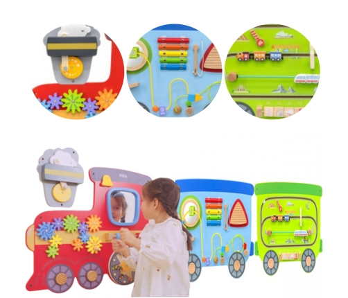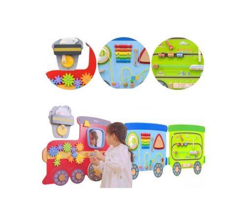 Kolorowy zabawkowy pociąg marki Viga Toys to drewniana, wielofunkcyjna zabawka na ścianę, która dostarczy dzieciom wiele godzin świetnej zabawy i nauki. Zabawka składa się z trzech odrębnych sekcji: czerwona lokomotywa z kołami zębatymi, młyńskim kołem i lustrem; niebieski wagon z cymbałkami, pętlą motoryczną i wyrzutnią koralików; oraz zielony wagon z interaktywną przesuwną kolejką i klockami do obracania przedstawiającymi sławne miejsca. Każda sekcja oferuje różnorodne atrakcje, które stymulują zmysły i umiejętności maluchów, zapewniając im jednocześnie mnóstwo radości.