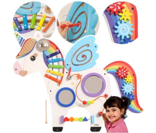 Wielofunkcyjna tablica ścienna z uroczym wizerunkiem jednorożca. Tablica jest zabawką, na której jednocześnie może bawić się kilkoro dzieci. Mogą nie tylko bawić się dla przyjemności, ale także wiele się nauczyć. Pomaga w nauce kolorów, dźwięku, grafiki. Rozwija również koordynację ręka-oko oraz umiejętności społeczne. Genialna kombinacja zabawek dla szkół, przedszkoli, centrów nauki oraz miejsc publicznych.