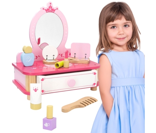 Piękna różowa toaletka od Viga to wymarzony mebel w pokoju każdej dziewczynki. Toaletka posiada wysuwaną szufladę, w której mała księżniczka może schować swoje skarby. Do zestawu dołączone są jeszcze liczne akcesoria. Całość wykonana z drewna i pomalowana nietoksycznymi farbami bezpiecznymi dla dzieci i środowiska.