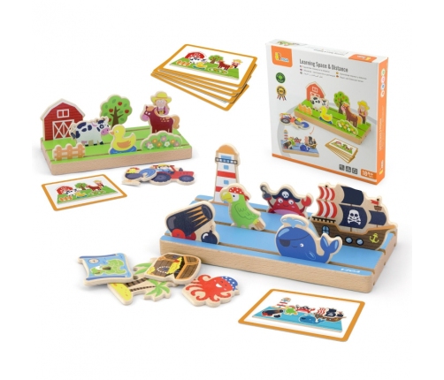 Układanka zawiera elementy do układania na podstawie oraz karty do odwzorowywania. Dziecko układa poszczególne elementy w jednym z trzech przygotowanych rowków. Następnie jego zadanie polega na określeniu odległości i zależności pomiędzy ułożonymi obiektami.