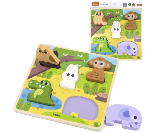 Klasyczne Drewniane Puzzle od marki VIGA w motywie lasu. W zestawie znajduje się kolorowa plansza oraz 5 elementów ze zwierzątkami. Zabawa polega na dopasowaniu kafelków zwierząt do odpowiednich miejsc na kolorowej podstawce. Taka zabawa pomoże kształtować precyzję ruchów rączek, oraz poprawić koordynację wzrokowo-ruchową, a także ćwiczyć pamięć, logiczne myślenie i koncentrację.