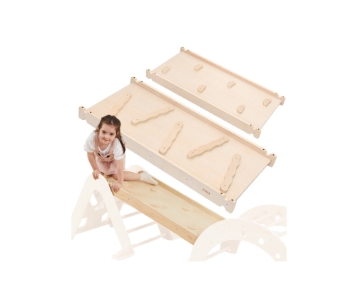 Drewniana Zjeżdżalnia od marki VIGA jest wielofunkcyjnym elementem domowego placu zabaw, który łączy się z bujakiem (44710) i trójkątem wspinaczkowym (44708). Po jednej stronie znajdziemy płaską powierzchnię, która może być wykorzystana jako zjeżdżalnia czy też kładka. Natomiast po drugiej stronie znajdziemy ściankę wspinaczkową.
