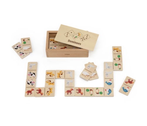 VIGA Drewniane Domino 2w1 Zwierzęta i Liczby to doskonała zabawa edukacyjna, która w zabawny uczy dzieci logicznego myślenia i podstaw matematyki. Dzięki dwustronnym płytkom maluchy mogą grać w klasyczne domino z kropkami lub uczyć się poprzez dopasowywanie zwierzątek. Gra polega na dokładaniu płytek od końca do końca – zwycięzcą zostaje ten, kto pierwszy pozbędzie się wszystkich swoich elementów. Dzięki solidnemu, drewnianemu pudełku zestaw można łatwo przechowywać i zabierać ze sobą w podróż. Drewniane domino to świetny sposób na naukę poprzez zabawę – zarówno samodzielnie, jak i w gronie rodziny czy przyjaciół.