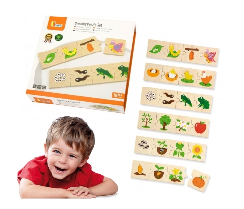 Zestaw zawiera 24 drewniane elementy na których znajdują się kolorowe obrazki przedstawiające etapy życia zwierzątek, poczynając od ich narodzin.
