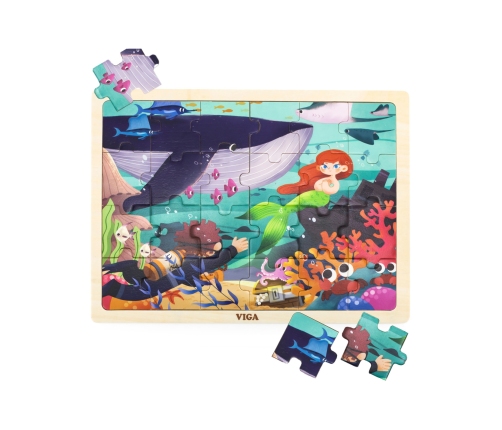 Puzzle Sekrety Morza od marki VIGA to układanka będąca elementem serii. Wszystkie puzzle z serii znajdują się w drewnianej podstawce, która nie tylko zapewni stabilną powierzchnię do ułożenia puzzli, ale również zawiera obrazek, który dziecko powinno ułożyć. Dodatkową pomocą jak i też elementem, który można wykorzystać do dalszej nauki jest to, że wszystkie elementy układanki są ponumerowane od 1 do 24. Dzięki tym pomocom dziecko nie powinno się zniechęcić przy układaniu. Układanka Sekrety Morza zawiera obrazek z syrenką, nurkiem, dużą ilością różnych rybek, rafą koralową, zatopionym statkiem oraz ukrytym skarbem.