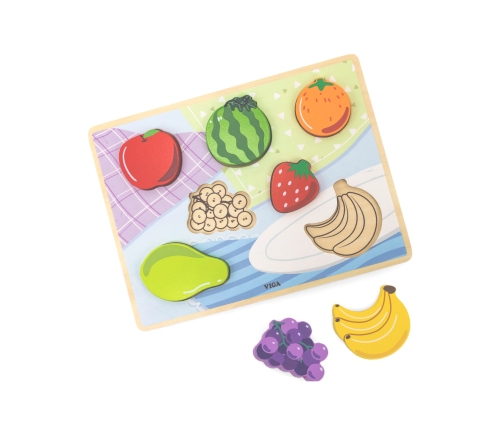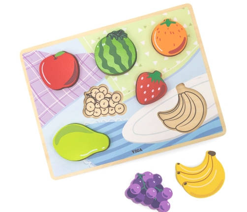 Drewniane Puzzle od marki VIGA w motywie owoców. W zestawie znajduje się kolorowa plansza oraz 7 elementów. Zabawa polega na dopasowaniu kafelków owoców do odpowiednich miejsc na kolorowej podstawce, na której dla ułatwienia znajdziemy rysunki brakujących elementów. Taka zabawa pomoże kształtować precyzję ruchów rączek, oraz poprawić koordynację wzrokowo-ruchową, a także ćwiczyć pamięć, logiczne myślenie i koncentrację. Dzięki grubości elementów, puzzle mogą być wykorzystywane do innych zabaw jako figurki.