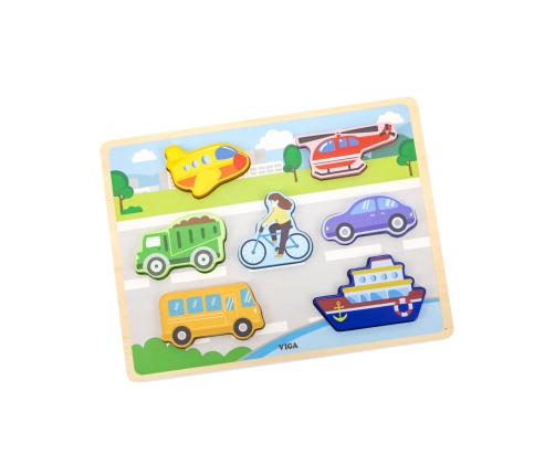 Drewniane Puzzle od marki VIGA w motywie środków transportu. W zestawie znajduje się kolorowa plansza oraz 7 elementów. Zabawa polega na dopasowaniu kafelków pojazdów do odpowiednich miejsc na kolorowej podstawce, na której dla ułatwienia znajdziemy rysunki brakujących elementów. Taka zabawa pomoże kształtować precyzję ruchów rączek, oraz poprawić koordynację wzrokowo-ruchową, a także ćwiczyć pamięć, logiczne myślenie i koncentrację. Dzięki grubości elementów, puzzle mogą być wykorzystywane do innych zabaw jako figurki.