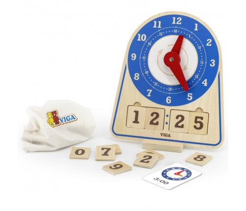 Drewniany Zegar do nauki godzin i czasu od znanej i cenionej marki Viga jest wspaniałym przykładem jak fajnie i pożytecznie można spędzać wolny czas z twoją pociechą. Jest to stojąca zabawka, która zawiera 12 kart instruktażowych. Na górze znajduje się tarcza zegara mechanicznego, a na dole wyświetlacz czasu zegara elektronicznego. Dziecko za pomocą kart może uczyć się godzin, lub może samodzielnie ustawić jaki tylko chce czas. Dzięki zabawie dziecko rozwija koordynację ręka-oko oraz rozwija umiejętność logicznego myślenia. Do zestawu dodana jest ekologiczna torba, w której w łatwy sposób można przechowywać dodane akcesoria. Produkt przeznaczony dla dzieci powyżej 3 roku życia. Całość wykonana została z drewna lakierowanego i pomalowana nietoksycznymi farbami w żywe barwy, które zadowolą każdego użytkownika i dadzą mnóstwo radości z zabawy. Pomóż dzieciom poznać czas za pomocą drewnianego zegara!