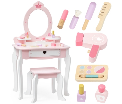 Duża Drewniana toaletka z marki Viga to wyjątkowa drewniana toaletka dla małej księżniczki, która spełni marzenia każdej dziewczynki! Wykonana z najwyższej jakości drewna, w delikatnych odcieniach różu i bieli, ta urocza toaletka zachwyca swoim bajkowym designem. Stylowe, zaokrąglone kształty, subtelne zdobienia i eleganckie nóżki sprawiają, że doskonale komponuje się w pokoju dziecięcym, dodając mu uroku i magii.Toaletka rozwija kreatywność, wyobraźnię i zachęca do odgrywania ról. Jest również doskonałym pomysłem na prezent – solidne wykonanie i estetyczny wygląd sprawią, że będzie służyć przez lata.