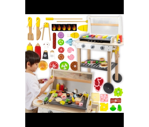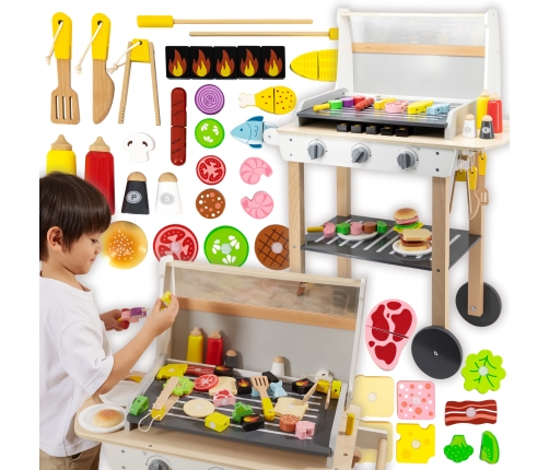 Drewniany Grill Barbecue od marki VIGA jest jak prawdziwy grill! Zestaw zawiera 47 akcesoriów, takich jak słoiki z przyprawami, keczup, musztardę, szczypce, sztućce itp. Realistyczności dodają efekty dźwiękowe. Dzieci mogą tworzyć szaszłyki, kanapki, burgery. Zdejmowana pokrywa pozwala zabezpieczyć "gorący" ruszt po grillowaniu, a kółeczka i wygodny uchwyt pozwalają przewozić grill w dowolne miejsce ogrodu lub domu. Dziecko będzie mogło wcielić się w rolę dorosłego, który pilnuje rodzinnego grilla.