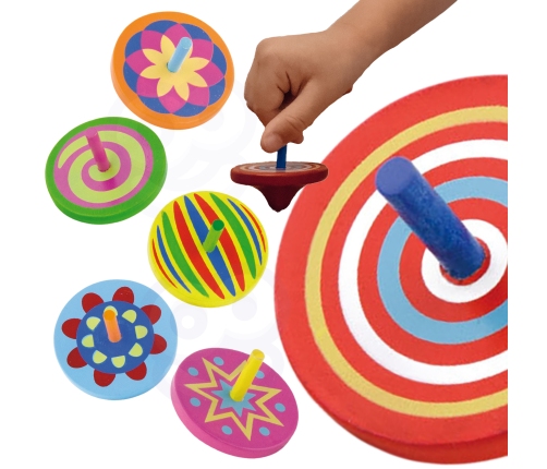 Kolorowe drewniane bączki zachwycą dziecko podczas zabawy. Podczas kręcenia się bączki tworzą ciekawe wzory, które spodobają się dzieciom.