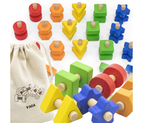 Nakrędki i i Śrubki to zabawka zręcznościowa marki VIGA polegająca na wkręcaniu, wykręcaniu kolorowych kształtów. Świetna zabawa dla dziecka podczas mieszania i dopasowywania a przy okazji ucząca liczenia, kolorów i kształtów. Wkręcanie i odkręcanie poprawi u malucha zręczność manualną i wzrokową koordynację ruchową Zestaw zawiera 40 elementów, 20 par nakrętek i śrub w 5 jaskrawych kolorach i kształtach oraz bawełnianą torbę ułatwiającą przechowywanie.