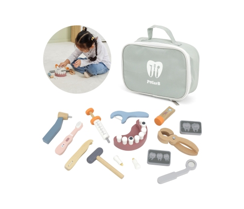 Drewniany Zestaw Dentysty z serii PolarB od marki Viga jest jedną z tych zabawek, które poprzez zabawę w odgrywanie ról sprawią, że dziecko pozbędzie się strachu i nabędzie pewności siebie w stresujących sytuacjach, które mogą go czekać w przyszłości. Wizyty u dentysty mogą być prostsze i bardziej przyjemne, gdy minie lęk przed sprzętem dentystycznym. W zestawie znajdziemy poręczną torbę, a w niej zestaw zabawek drewnianych, w tym: zestaw zębów (w tym dwóch dodatkowych), wiertło, szczypce do wyrywania zębów, szczoteczkę, nić dentystyczną, pęsetę, zdjęcia rentgenowskie, lustereczko, młoteczek i tubkę pasty.