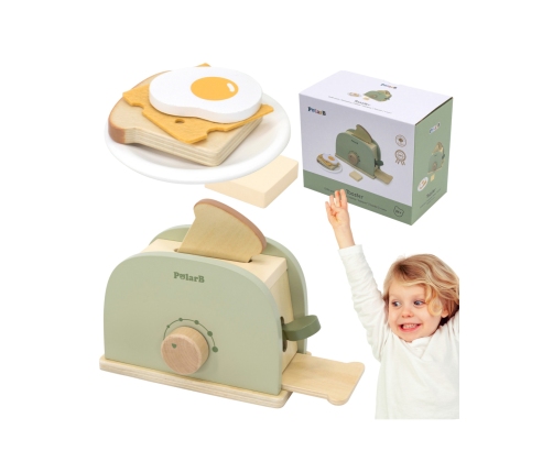 Drewniany, stylowy zielony toster z serii PolarB do kreatywnej zabawy w gotowanie. Rozwija zdolności poznawcze, manualne, kreatywność, wyobraźnię i fascynacje światem tworzenia posiłków. Wspaniały dodatek do dziecięcej kuchni. Należy przekręcić pokrętło, a następnie pociągnąć za dźwignię. Wtedy gotowe tosty wyskoczą jak prawdziwe! Przy kręceniu pokrętłem usłyszymy realistyczne dźwięki Pięknie wykonana, bezpieczna zabawka.