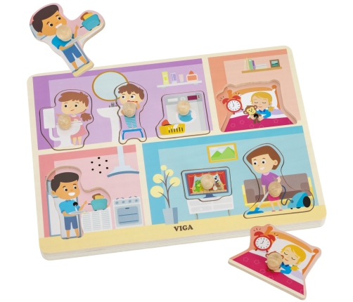 VIGA Puzzle Dźwiękowe Dopasuj Codzienne Aktywności to interaktywna układanka, która wprowadza dziecko w świat codziennych czynności. Ta edukacyjna zabawka rozwija zdolności manualne i poznawcze, zachęcając do interaktywnej zabawy. Po podniesieniu i ponownym dopasowaniu elementu dziecko usłyszy realistyczny dźwięk codziennych aktywności takich jak gotowanie, sprzątanie czy mycie zębów. Doskonała propozycja dla maluchów, które chcą poznawać świat poprzez interaktywną zabawę.