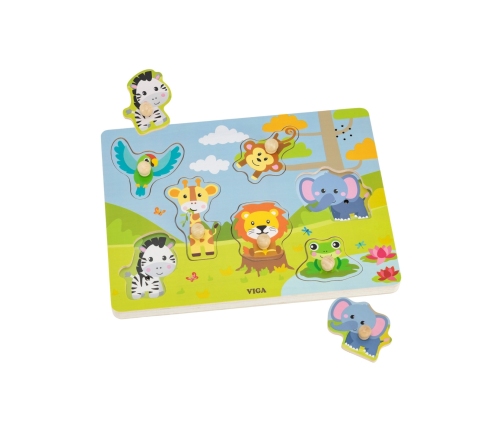 VIGA Puzzle Dźwiękowe Dopasuj Zwierzęta Egzotyczne pomaga odkryć fascynujący świat zwierząt dżungli. Ta edukacyjna układanka to doskonała zabawa, która rozwija zdolności manualne i poznawcze dziecka. Po podniesieniu i ponownym dopasowaniu elementu dziecko usłyszy realistyczny dźwięk zwierzęcia, co wzmacnia naukę poprzez doświadczenie. Doskonała propozycja dla małych odkrywców, którzy uwielbiają interaktywną naukę
