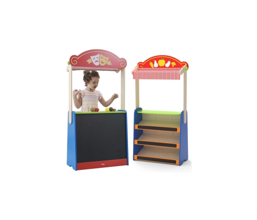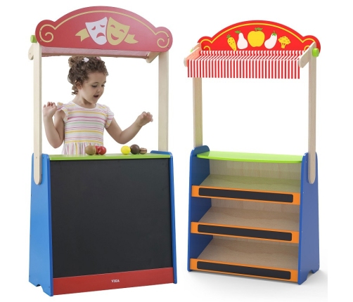 Ta wysokiej jakości zabawka marki Viga Toys to połączenie teatru i sklepu spożywczego. Wystarczy odwrócić zabawkę i możemy już wcielać się w zupełnie nowe role.