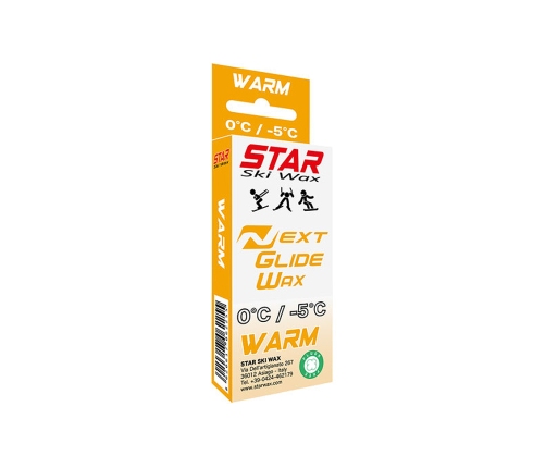 Attribute:0° -5°C. , Этот высококачественный воск был разработан для тренировок и отдыха. Воск имеет низкую вязкость при рекомендуемой 120°C температуре утюга, обеспечивая отличное проникновение и надежное насыщение базы., Выдающееся соотношение качества и цены делает линию Next Solid отличным выбором для любителей, которые хотят самостоятельно заниматься парафинированием, а также для команд и клубов, которые хотят поддерживать лыжи в хорошем состоянии во время тренировок. Как и во всех продуктах Star Next, в них используется керамическая технология и другие добавки, обеспечивающие наилучшие характеристики без использования фтора., Next Solid Glide Wax поставляется в бумажной упаковке по 60 г, исключающей использование пластика для более бережного отношения к окружающей среде. Подходит для всех дисциплин.