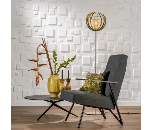 Izdekorējiet savu sienu ar dažāda izmēra un dziļuma kvadrātiem un izbaudiet lielisku skatu! Šo 3D sienas dekoru izmērs ir 50 x 50 cm, tādēļ jūs tos viegli varat uzstādīt pats. Wall Art 3D sienas flīžu oriģinālā krāsa ir pelēkbalta, taču trīs dimensiju flīzes var nokrāsot ar jebkādu krāsu (ūdens vai eļļas bāzes) jums vēlamajā krāsā!