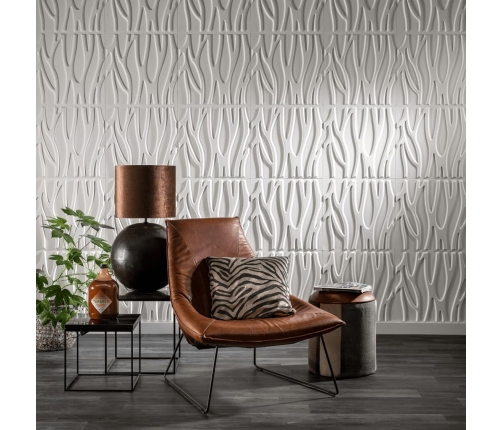 Šie Julotte dizaina sienas paneļi lieliski iederēsies jebkurā interjerā. Katra trīs dimensiju paneļa izmērs ir 50 x 50 cm, tāpēc jūs tos varēsiet vienkārši uzstādīt pats. Sūtījumā ir iekļauti 24 sienas paneļi, ar kuriem var noklāt 6 m² lielu laukumu. Wall Art 3D sienas flīžu oriģinālā krāsa ir pelēkbalta, taču trīs dimensiju flīzes var nokrāsot ar jebkādu krāsu (ūdens vai eļļas bāzes) jums vēlamajā krāsā!