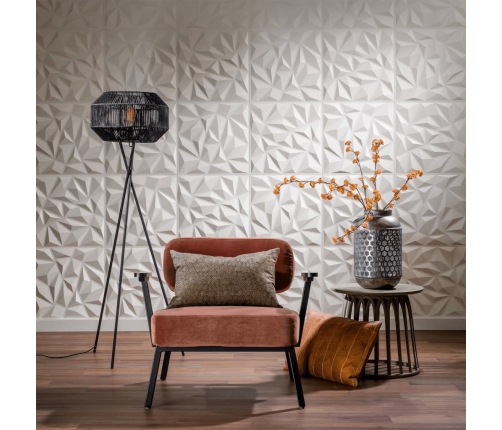 Šie Puck dizaina sienas paneļi lieliski iederēsies jebkurā interjerā. Katra trīs dimensiju paneļa izmērs ir 50 x 50 cm, tāpēc jūs tos varēsiet vienkārši uzstādīt pats. Sūtījumā ir iekļauti 12 sienas paneļi, ar kuriem var noklāt 3 m² lielu laukumu. Wall Art 3D sienas flīžu oriģinālā krāsa ir pelēkbalta, taču trīs dimensiju flīzes var nokrāsot ar jebkādu krāsu (ūdens vai eļļas bāzes) jums vēlamajā krāsā!