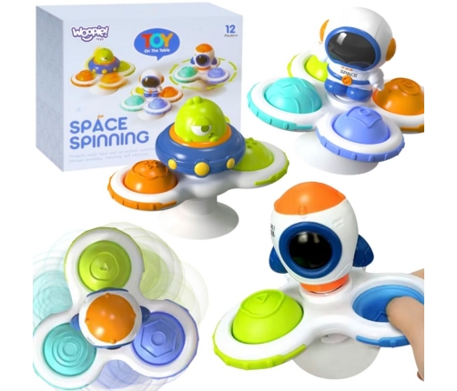 Zestaw Kosmicznych Spinnerów od marki WOOPIE zrobi na dziecku duże wrażenie. W zestawie znajdują się 3 szt. spinnerów: Kosmita, rakieta kosmiczna i kosmonauta. Spinnery dziecko może zabrać i przyczepić wszędzie dzięki gumowym przyssawkom. Można przyczepić spinnera zarówno do szyby w czasie podróży oraz do wanny podczas kąpieli (zabawkę można moczyć). Łożyska spinnerów gwarantują długotrwały obrót. Odczepiane elementy pozwalają na łączenie ich w dowolny sposób. Zabawki posiadają gumowe elementy o różnej powierzchni co rozwinie zmysły dziecka oraz zadziała odstresowująco. Zabawa ćwiczy zwinność rączek oraz poprawia koordynację ręka-oko. Te zabawki mogą działać jako narzędzie do relaksacji i redukcji stresu, pomagając w osiągnięciu stanu spokoju i wyciszenia.