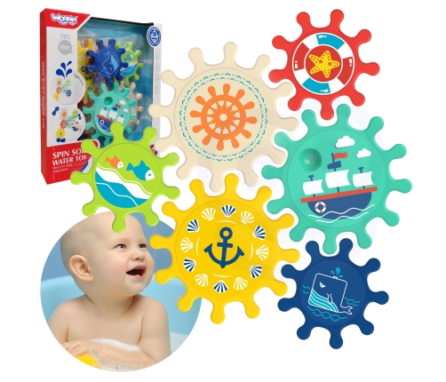 Kolorowe zębatki od marki Woopie to zabawka umilająca dzieciom czas podczas kąpieli. Zestaw składa się z 6 kolorowych trybików w dwóch wielkościach. Przyssawki znajdujące się przy każdym trybiku umożliwiają przymocowanie go do płytek, wanny czy prysznica, w taki sposób aby elementy zazębiały się. Dziecko podczas zabawy ruszając jeden element wprawia w ruch całą zbudowaną przez siebie konstrukcję. Maluch bawiąc się poznaje zasadę przyczynowo - skutkową, rozwinie zmysły a kolorowa morska grafika zachęci do zabawy i urozmaici zabawę pod prysznicem lub w wannie.
