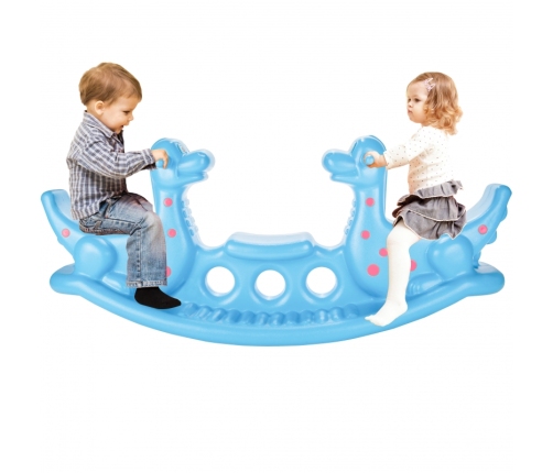 Bujak Dino Wieloosobowy w kolorze jasno niebieskim marki Woopie stanie się najulubieńszym dinozaurem twoich dzieci! Z bujaka może korzystać troje dzieci jednocześnie, a nawet jedno będzie się świetnie bawić! Gdy dwoje dzieci buja się jednocześnie to Dino może spełnić funkcje huśtawki równoważnej i dzieci współpracując mogą się huśtać bez końca. Bujak sam w sobie dostarcza wiele korzyści dla dzieci: bujanie uspokaja dziecko oraz rozwija zdolności motoryczne ciała, co jest idealne dla prawidłowego rozwoju. Dodatkowo dinozaury mogą oddziaływać na wyobraźnie oraz kreatywność Twojego dziecka. Z produktu można korzystać zarówno w domu jak, i na zewnątrz!