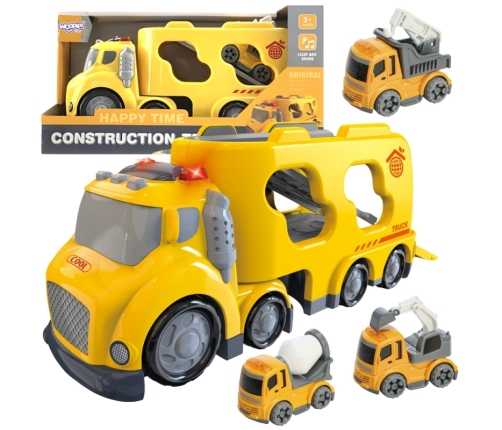Laweta Construction Truck z serii CITY TRUCK to idealna zabawka dla każdego małego fana motoryzacji i miejskich pojazdów specjalnych. W skład zestawu wchodzi żółta laweta przewożąca małe pojazdy budowlane. Zabawka została wykonana z trwałego tworzywa sztucznego, wyposażona w efekty świetlne i dźwiękowe, które aktywują się po naciśnięciu przycisku na dachu pojazdu.