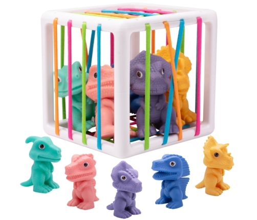 - - w zestawie: kostka-sorter + 5 miękkich klocków sensorycznych-dinozaurów,
