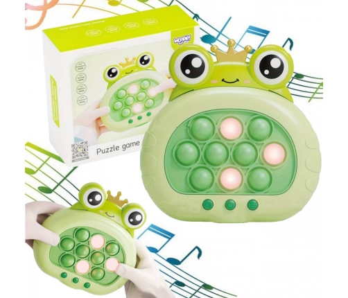 Gra POP IT Żabka to zabawka antystresowa, która sprawdzi się już dla najmłodszych. Gra wydaje radosne dźwięki, które zachęcają dzieci do zabawy i urozmaicają rozgrywkę. Zabawka jest niewielka więc, sprawia, że możemy zabrać ją ze sobą. Pop It sprawia frajdę dzieciom oraz dorosłym, którzy chętnie po nią sięgają. Rozwija umysł, zdolności manualne, koordynację wzrokowo-ruchową oraz trenuje spostrzegawczość i pomaga w walce ze stresem.