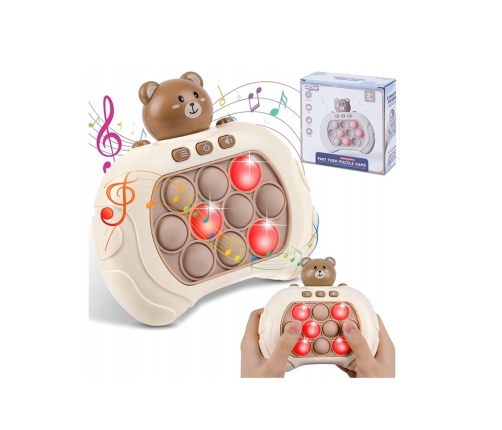 Gra POP IT Miś to zabawka antystresowa, która sprawdzi się już dla najmłodszych. Gra wydaje radosne dźwięki, które zachęcają dzieci do zabawy i urozmaicają rozgrywkę. Zabawka jest niewielka więc, sprawia, że możemy zabrać ją ze sobą. Pop It sprawia frajdę dzieciom oraz dorosłym, którzy chętnie po nią sięgają. Rozwija umysł, zdolności manualne, koordynację wzrokowo-ruchową oraz trenuje spostrzegawczość i pomaga w walce ze stresem.