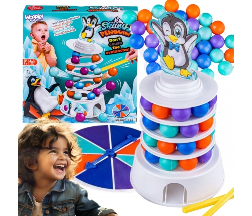 Najpierw składamy naszą chwiejącą się wieżę. Posłuży nam do tego podstawa, na której układamy kolorowe piłeczki. Następnie nakładamy kolejne warstwy naszej góry lodowej i piłeczek. Wieżę wieńczymy przykryciem z wesołym pingwinem. Zabawa polega na wciskaniu do środka naszej wieży piłeczki w wylosowanym wcześniej kolorze. Cała konstrukcja jest ruchoma i niestabilna więc to wcale nie takie proste zadanie. Przegrywa osoba, która przewróci wieżę i doprowadzi do upadku pingwinka.