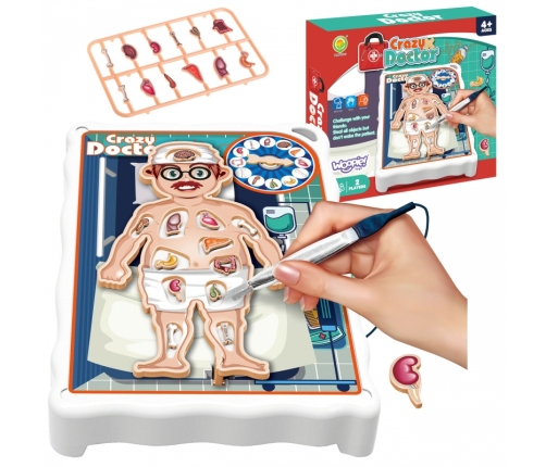 Gra Zręcznościowa Szalony Lekarz od marki WOOPIE. Gra przeznaczona dla dzieci od 4-ego roku życia, w której wcielamy się w doktora i przeprowadzamy operację. Organy umieszczamy w pacjencie, a następnie kręcąc na kole dowiadujemy się jaki organ musimy "usunąć". Należy to robić bardzo precyzyjnie, ponieważ gdy tylko dotkniemy organem naszego pacjenta on zadrży co prowadzi do przegranej. Gra rozwija koordynacje wzrokowo-ruchową, doskonali precyzje, cierpliwość i skupienie.