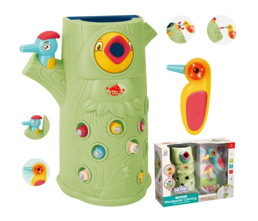 Gra Zręcznościowa Złap Robaczka od marki WOOPIE to doskonały sposób na wspólne spędzanie czasu z dzieckiem. Proste zasady oraz intuicyjna obsługa sprawiają, że zagrać w nią może praktycznie każdy. Zabawa polega na chwytaniu dzięciołem zakończonym magnesem robaczków ukrytych w otworkach znajdujących się w drzewie, a następnie na ich ponownym wkładaniu w dziób ptaszka. W zestawie oprócz dwóch dzięciołów do karmienia pisklaka i kłody z pisklakiem, znajduję się aż 9 robaków. Większy dzięcioł posiada dodatkowe funkcje: świeci, rusza dziobem i wydaję dźwięk oraz melodię. Wystarczy nacisnąć na trzon i zapala się oko dzięcioła oraz wydobywa się skoczna przyjemna melodia, ptak może też ruszyć dziobem w dół., a jego oko zaświeci się przy dźwięku ćwierkania. Zestawem może się bawić jednocześnie dwoje dzieci. Gra uczy przez zabawę - pomoże rozwinąć m. in. umiejętności motoryczne (ruchowe) oraz wzrokowe. Zabawka jest sporym wyzwaniem dla malucha, wymaga skupienia uwagi oraz sprawności manualnej, ale przez to niezwykle zaciekawi dziecko.