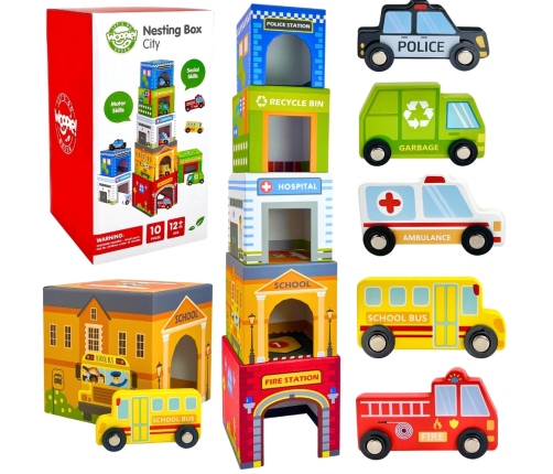 Układanka Miasto od marki WOOPIE z serii GREEN to doskonała alternatywa tradycyjnych układanek i klocków. Dzieci dzięki kolorowym, pełnych ilustracji kostkom z łatwością połączą naukę z zabawą. Dodatkowo zestaw zawiera drewniane pojazdy z gumowymi kółeczkami! Dziecko samo decyduje jaka konstrukcję zbuduje. Kostki są ilustrowane w logiczny sposób rozwijający percepcje dziecka np. na największej umieszczony jest numer 1, a na najmniejszej numer 5. Dziecko łatwo może nauczyć się liczb przez układanie wieży od największego do najmniejszego numeru. Pomaga w rozróżnianiu pojazdów i ważniejszych instytucji miasta jak np. straż, szkoła czy szpital. Na pudełka napisane są angielskie nazwy budynków, co może pomóc w nauce angielskiego w późniejszym etapie życia. Kostki mogą być dodatkowo wykorzystane jako miejsce na przechowywanie różnych przedmiotów, takich jak kredki czy też długopisy. Dziecko może zabawić się i wyobrazić sobie życie w mieście oraz pobudzić kreatywność wymyślając różne historie. Zabawka nie zawiera ostrych krawędzi i pomalowana jest nietoksycznymi farbami bezpiecznymi dla Twojego dziecka.
