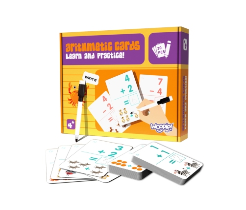 Fiszki do nauki liczenia od marki WOOPIE to świetny pomysł na prezent dla naszych pociech. To rewelacyjny zestaw, który składa się z 30 dwustronnych kart zachęcających dziecko do nauki cyfr i liczenia. Zestaw został wykonany tak aby dziecko mogło wielokrotnie trenować liczenie dzięki dołączonemu do zestawu ścieralnemu markerowi. Karty podzielone są na te z odejmowaniem i dodawaniem. Aby ułatwić naukę, karty zawierają dwa poziomy- na początku dziecko może korzystać ze strony gdzie działania matematyczne wzbogacają obrazki, którymi dziecko może sobie pomóc podczas obliczania wyniku. Druga strona kart to już obliczenia bez pomocy obrazków- Dzięki takiemu modułowi nauki, twoje dziecko nie będzie wyczuwało presji trudności nowej wiedzy, a rozwiązywanie przykładów matematycznych to będzie czysta przyjemność! Aby zmotywować swojego malucha do nauki, po każdym dobrze rozwiązanym przykładzie można narysować w rogu karty serduszko!