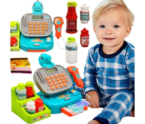Касса Dino с полкой от WOOPIE — отличный набор для игр. Дети могут выбрать товары, которые они хотят купить, а затем провести их через кассу. С помощью сканера они могут отсканировать печенье и другие продукты. После этого покупатель может заплатить деньгами или картой.