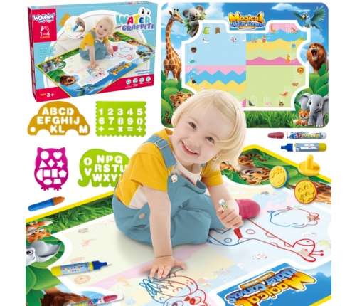 Mata do Malowania Wodą marki WOOPIE to edukacyjny zestaw artystyczny dla dzieci od 3 roku życia. Wystarczy napełnić dołączone pisaki/pędzelki czystą wodą, by odkrywać kolory, litery, liczby i kształty bez użycia tuszu i farb. Rysunki pojawiają się na chwilę, a po wyschnięciu znikają, zapraszając do kolejnej zabawy. Duży format 100×75 cm daje miejsce do wspólnego tworzenia, a wesoła grafika zwierząt z dżungli zachęca do nauki przez zabawę.