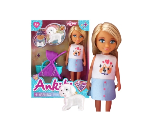 - - Śliczna laleczka z blond włosami, niebieskimi oczy, ubrana w białą bluzeczkę z uroczym nadrukiem pieska i błękitną spódniczkę.