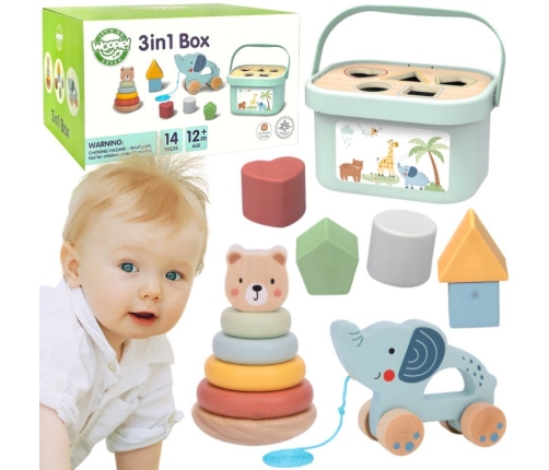 Сортер с игрушками 3 в 1 от Woopie — это классический набор игрушек, который включает 5 кубиков различных форм и цветов, пирамидку в виде медвежонка для сборки, слоника для толкания и тянущегося, а также пластиковую коробку для хранения. В коробке есть пять отверстий разных цветов, которые помогают детям развивать навыки распознавания форм и сортировки элементов в соответствующие отверстия. Пирамидка с медвежонком состоит из 4 цветных колечек и головы медвежонка, которые установлены на балансирующей деревянной основе, позволяя детям складывать колечки по размеру и совершенствовать мелкую моторику. Слоник — это милое дополнение, которое помогает ребенку тренировать ходьбу и равновесие. Все игрушки из набора удобно помещаются в коробку с ручкой для переноски, что облегчает хранение и транспортировку.