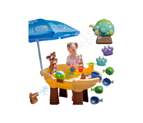 Stolik Wodny Piracka Łódź marki Woopie to niezwykła zabawka, która przenosi dzieci w świat pirackich przygód i zapewnia godziny kreatywnej zabawy na świeżym powietrzu. Dzięki bogatemu zestawowi kolorowych akcesoriów, ruchomym elementom i pirackiej wieży maluchy mogą eksperymentować z wodą, bawić się bąbelkami, kręcić kołem wodnym i odkrywać mnóstwo możliwości zabawy. Dołączony parasol pozwoli na komfortową zabawę w nawet najgorętsze dni. Prosta, solidna konstrukcja oraz duże rozmiary sprawiają, że stolik jest wygodny i atrakcyjny nawet dla kilku dzieci jednocześnie.