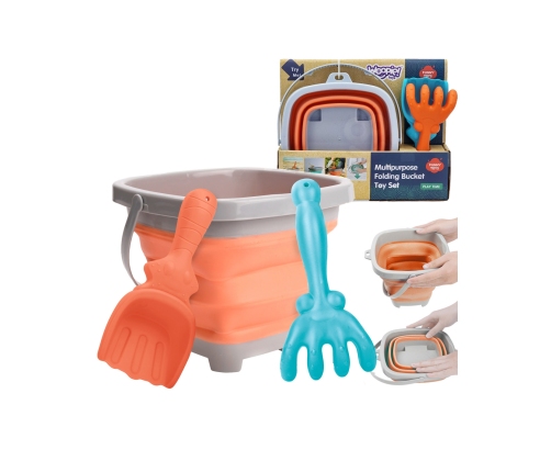 Silikonowe wiaderko z grabkami i łopatką od marki WOOPIE. Fantastyczne wiaderko do piaskownicy, na plażę lub do ogrodu, dzięki któremu dzieci miło spędzą czas na świeżym powietrzu. Wiaderko, dzięki składanej konstrukcji, zajmuje niewiele miejsca, jest łatwe w transporcie i wygodne do przechowywania.Zestaw zmieści się do dziecięcego plecaczka, do wózka czy plażowej torby.