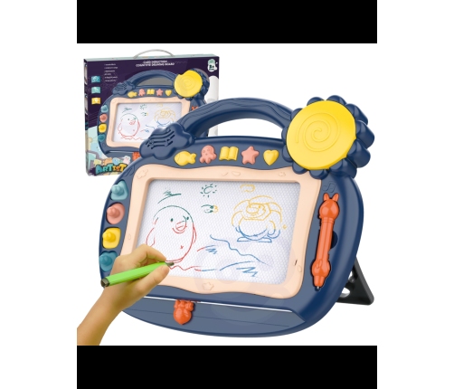 Znikopis Tablica Magnetyczna daje możliwość kreatywnej zabawy na długi czas! Tablica zachęca do pisania i rysowania. Rysowanie pozwoli wyciszyć i uspokoić się Twojemu dziecku. Znikopis pozwala na tworzenie nieskończonej ilość obrazków – wystarczy przejechać specjalnym suwakiem, a rysunek zniknie i można rysować od nowa! Zestaw dodatkowo zawiera wygodny długopis oraz aż 4 stempelki, które urozmaicą dzieło. Dodatkowo 5 multi funkcyjnych guzików, które mają ponad 400 opcji dźwiękowych, w tym: efekty dźwiękowe, taneczne piosenki dla dzieci, elektroniczne dźwięki, alfabet angielski oraz bęben. Tablica posiada wygodny uchwyt, dzięki czemu dziecko może zabrać ją wszędzie oraz posiada możliwość wystawienia nóżek, które ułatwia dziecku pisanie przy stole. Znikopis rozwinie u dziecka zdolności manualne, wyobraźnie, kreatywność oraz da szansę na rozwinięcie artystycznej strony dziecka!
