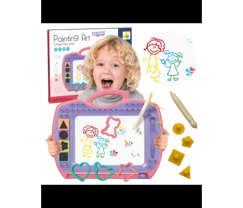 Znikopis Tablica Magnetyczna daje możliwość kreatywnej zabawy na długi czas! Tablica zachęca do pisania i rysowania. Rysowanie pozwoli skoncentrować, wyciszyć i uspokoić Twoje dziecko. Znikopis pozwala na tworzenie nieskończonej ilość obrazków – wystarczy przejechać specjalnym suwakiem, a rysunek zniknie i można rysować od nowa! Zestaw dodatkowo zawiera wygodny magiczny długopis, 4 stempelki oraz 4 wzory, które urozmaicą dzieło. Tablica posiada wygodny uchwyt, dzięki czemu dziecko może zabrać ją wszędzie. Znikopis rozwinie u dziecka zdolności manualne, wyobraźnie, kreatywność oraz da szansę na rozwinięcie artystycznej strony dziecka!